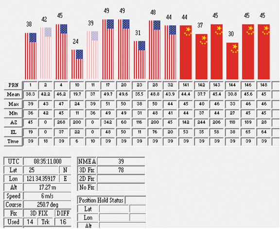 Like Galileo, BeiDou is a story of chapters. Chapter 1 was no ICD, and running on a demo dual-RF architecture as per the schematic shown in Figure 5. Chapter 2 was the same hardware with the test ICD, so all satellites, but still no positioning. Chapter 3 was the full ICD giving positioning in January 2013 (Figure 6), then running on the real Teseo-3 silicon in September 2013, shown in Figure 7.