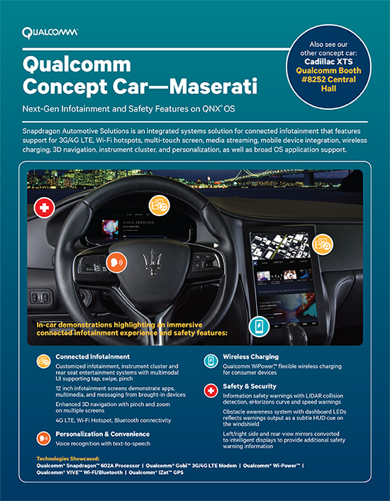 Qualcomm Technologies will demonstrate two new full technology concept cars that integrate Qualcomm Technologies’ latest in vehicle technology and connectivity at the 2015 Consumer Electronics Show, being held this week in Las Vegas. The technology concept cars are based on the 2015 Maserati Quattroporte GTS and the 2015 Cadillac XTS and have been customized to bring the full Snapdragon Automotive Solutions experience to life, including the Qualcomm Snapdragon 602A automotive-grade processor, Qualcomm Gobi 3G/4G LTE wireless modems and Qualcomm VIVE QCA6574 Wi-Fi and Bluetooth module, and Qualcomm IZat RGR7640 GNSS module. Qualcomm Snapdragon and Qualcomm Gobi are products of QTI, and Qualcomm VIVE and Qualcomm IZat are products of QCA.