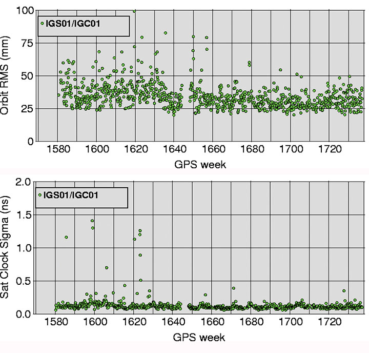 In terms of the IGS RTS, Figure 3 shows the performance of the combination solution produced by ESOC from the results of the contributing analysis centers. The plots show daily clock standard deviations and 1-D RMS orbit differences between the combination solution and the IGS rapid solution. It can be seen that the clock results are of the order of 0.1 nanosecond and the orbit differences at the level of 30–40 millimeters. The advantage of the combination is the ability to identify and eliminate outliers, by examining the differences between the contributing analysis-center solutions. It can be seen that the outliers affecting the early results have been eliminated, with very stable results since around GPS week 1650.