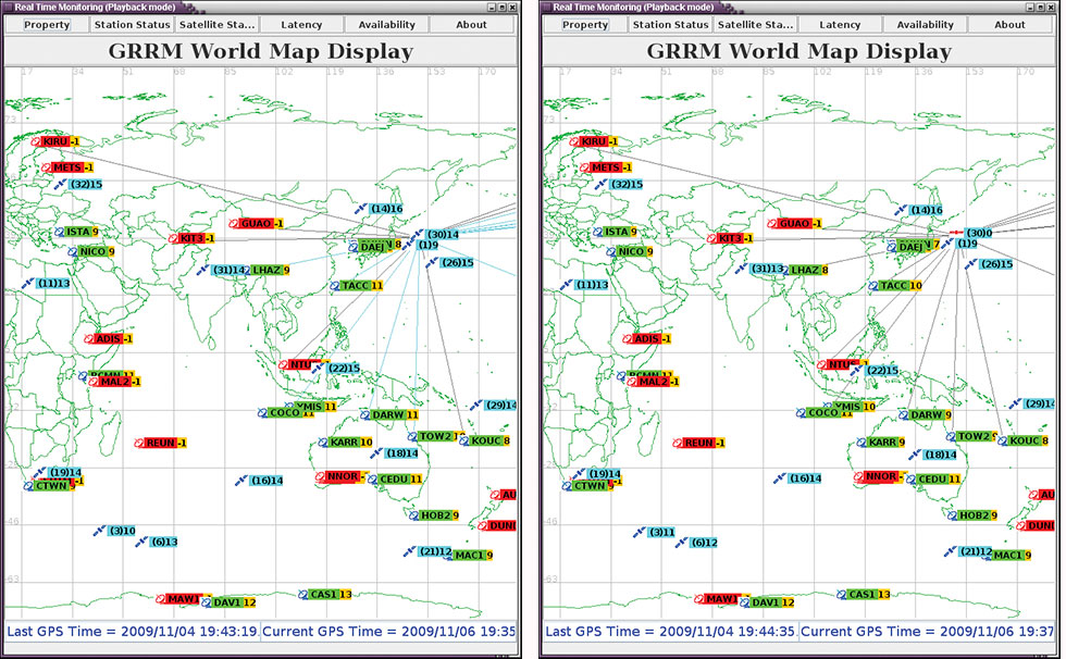 The software visualization capabilities also allow the possibility to identify and visualize signal problems with the satellites. In the example in Figure 6, GPS satellite G30 is seen to be tracked by 14 receivers at 19:43:19 on April 11, 2009. The live links are identified by the light blue lines radiating from the satellite. In the next snapshot, at 19:44:35, all 14 receivers appear to have lost the measurements from this satellite, as the grey lines indicate geometric visibility but no measurements arriving at the stations. At the same times, the receivers are continuing to track other satellites. This behavior has been observed a number of times and is known to affect only the Block IIA range of GPS satellites. A loss of measurements for a period of 1–2 minutes is typically observed.