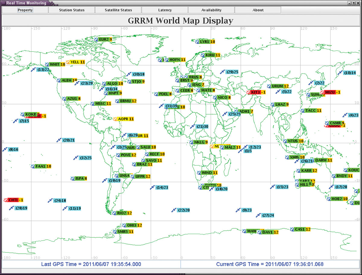 A network status monitoring display in the form of a world map (see Figure 2) gives the operator an overview of the network data flow. Station and satellite icons are color-coded to reflect the health of the live data links. It is also possible to see the number of live links to each station or from each satellite and the data latency and percentage availability of the observations from each station.