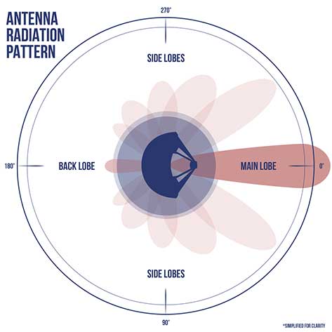 A simplified antenna radiation pattern with different lobes of radiation extending from the antenna. (Image: NASA)