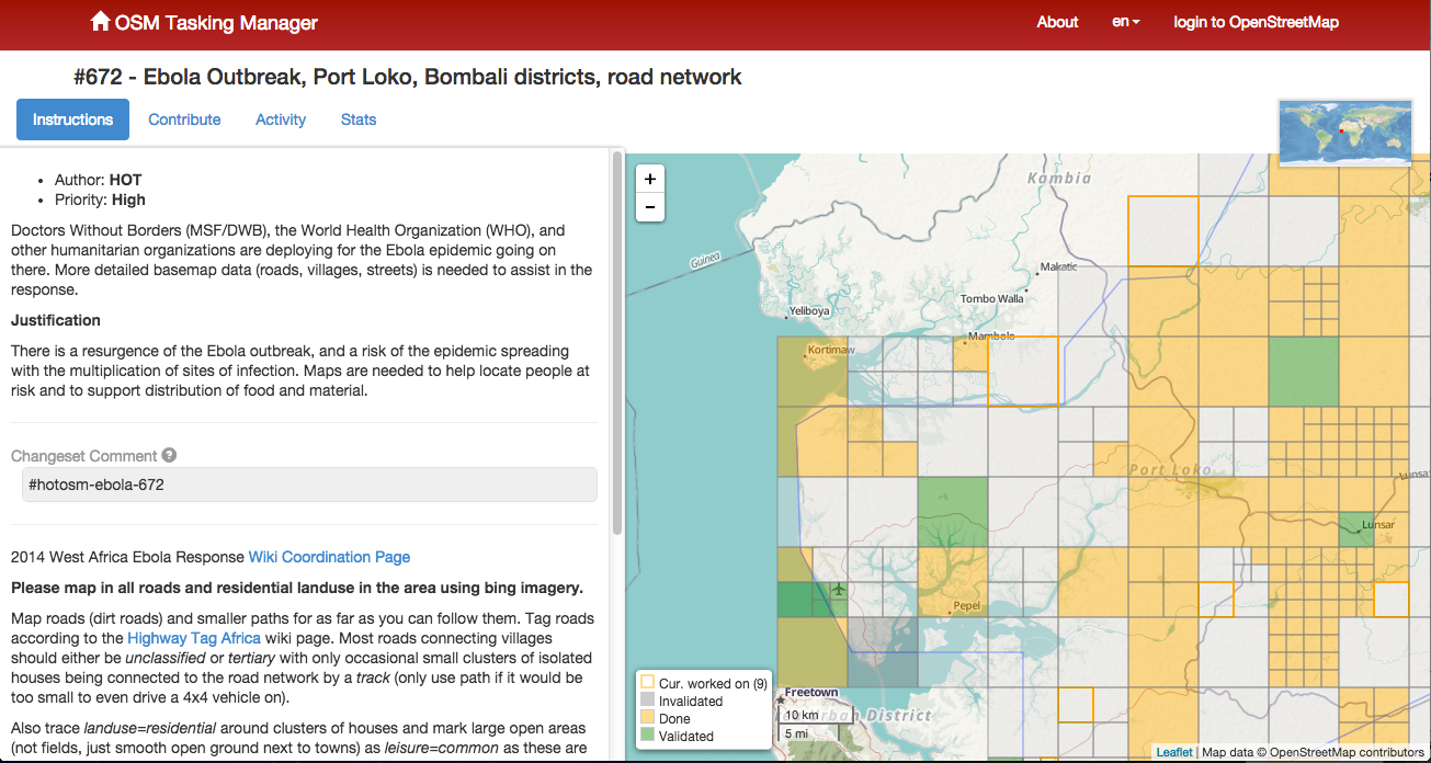 Just like the American Red Cross is currently doing, the GIS unit crowdsourced certain mapping tasks, which resulted in a substantial number of overview maps created with the help of close to 250 online volunteers. The volunteers helped to map previously unmapped cities and roads within a few days, and at a granular level, mapping individual buildings. These overview maps then became the foundation of many maps that the GIS officer created for the outbreak response.
