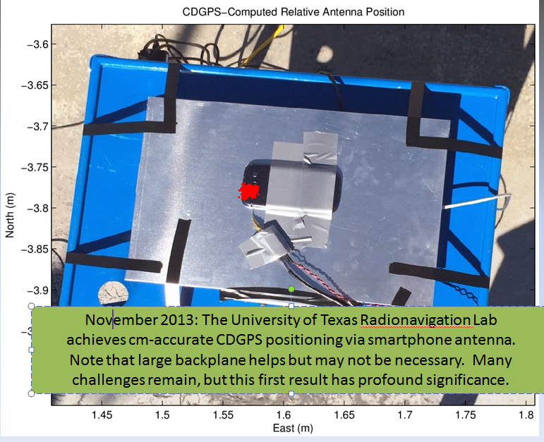 Dr. Todd Humphreys and his graduate assistants, including Ph.D. student Ken Pesyna, are part of the UT Radionavigation Laboratory. This team has been exploring, among other things, the feasibility of implementing RTK technology on smartphones. If you recall, in 2012 at the GPS World dinner during the Institute of Navigation (ION) GNSS Conference in Nashville, Dr. Humphreys proclaimed that RTK technology will be readily available on smartphones and tablets by the year 2020.