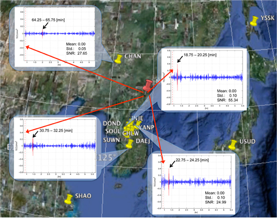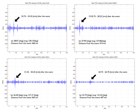 Figure 3. Traveling ionospheric disturbances (TIDs) detected at stations INJE (top left), DOND (top right), DAEJ (bottom left), and CHAN (bottom right). Click to enlarge.
