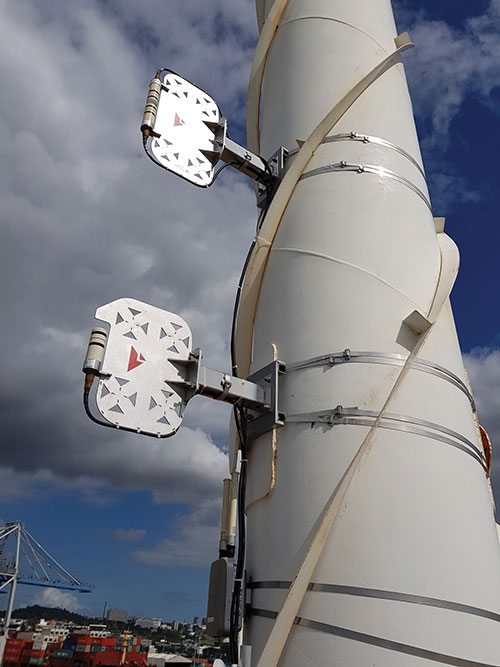 Two LocataLite transmitter antennas, installed 23 meters up a light pole, provide high-accuracy positioning coverage over part of the Ports of Auckland. (photo: Photo: David Small/Locata)