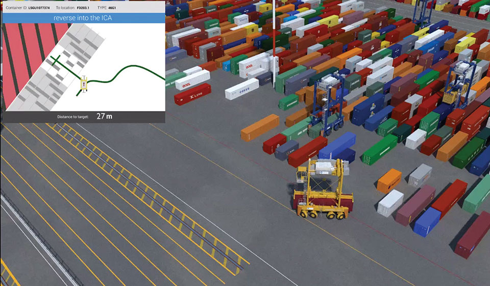 “Once they’ve first learned what to do in a simulator,” Clarke said, “they then carry out the same tasks with an instructor in a real straddle carrier. We also train our control room staff in a virtual training environment that’s a bit like a container terminal version of a flight simulator.” Figure 2 shows the screen of the operator training simulator.