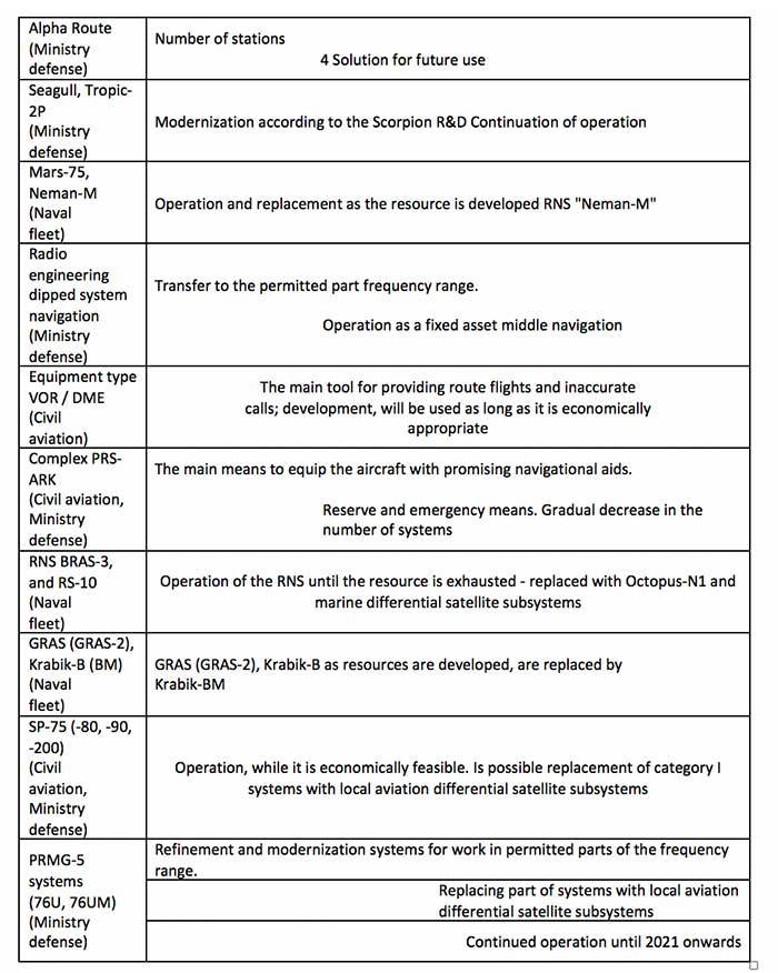 At over a hundred pages, this plan has a lot of information. It includes a table of 19 different navigation systems maintained by the government and the plan for each. This table also suffered when the document was transformed into the English version. The manual re-recreation is below: