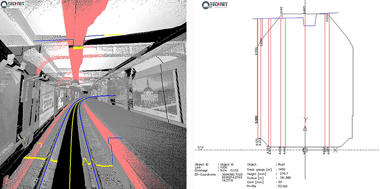 For determination and documentation of as-built railway and street networks from acquired data, Technet-Rail (Berlin, Germany) developed two software solutions, SiRailScan and SiRoadScan, for point-cloud analysis. The integrated mathematical algorithms ensure high-accuracy extraction and adjustment of the as-built left rail, right rail and center line, as well as of the roads’ border lines.