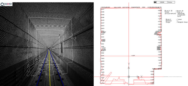 In response to the growing interest in application of the MLS technique and a-posteriori data adjustment for monitoring purposes, Technet-Rail developed additional tools for deformation analysis of structures such as tunnel bodies, railway bridges and road surfaces. The integrated software solutions enable comparison between the designed and as-built situation, epoch-wise analysis, modeling of the structure, development into 2D followed by color-coded deformation map (see Figures 4 and 5).