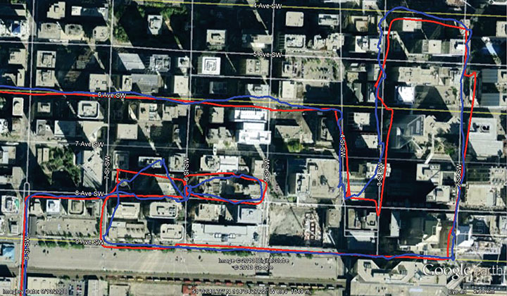 Figure 9 Downtown Calgary trajectory collected and processed on a Samsung Galaxy S III with changing misalignments in a gooseneck cradle. T-PN solution is in red and the GPS is provided in blue.