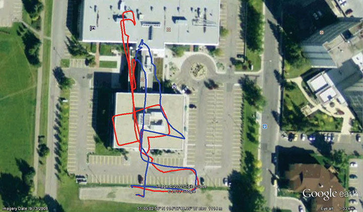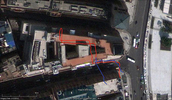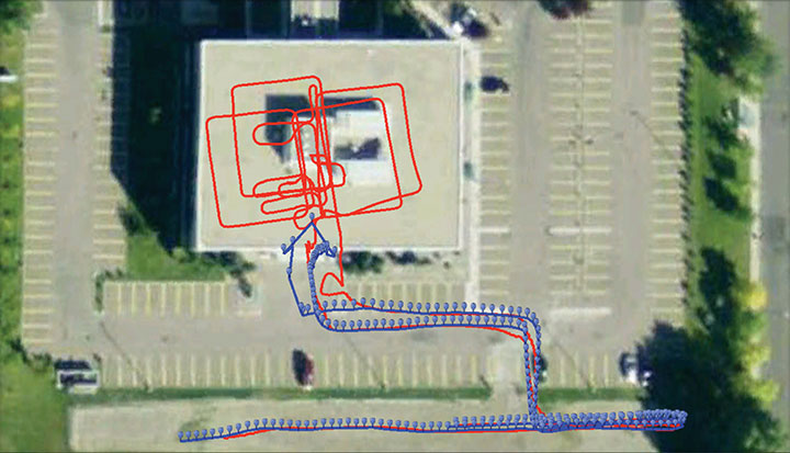 Tracking Applications. Another usage of T-PN can be related to tracking of personnel such as firefighters. In this case, the tracking device will be attached to the users for a high-accuracy solution. To show the performance, a Samsung Galaxy Nexus was tethered to the user in a chest mount strap. The user took a trajectory that started outdoors and then went indoors for over 9 minutes, covering multiple floors and taking elevators and stairs to access the different floors. At the end of the trajectory, the error was less than 6 meters, or 1.5 percent of the distance traveled. Figure 6 shows the results, with the red line showing the T-PN solution and the blue line showing the GPS solution.