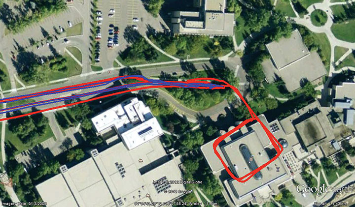 Figure 10. Underground parkade trajectory with wireless OBDII connection on a Samsung Galaxy S III running T-PN software. T-PN solution is in red and the GPS is provided in blue.