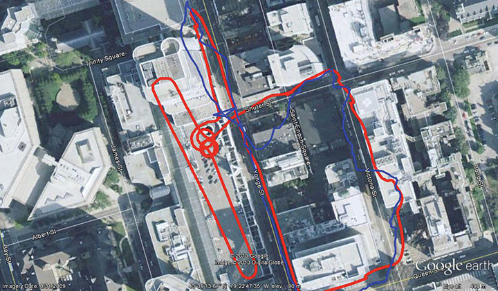 Consumer Vehicle Navigation. The results of using the T-PN platform on a Blackberry Playbook in real time in the downtown Toronto Eaton Centre parkade appear in Figure 8. The Playbook was left untethered on a seat during the navigation. The T-PN was able to bridge the complete loss of GPS signals (blue line) in the multi-level parkade, and to effectively filter the multipath in the GPS signals in the Toronto downtown core.
