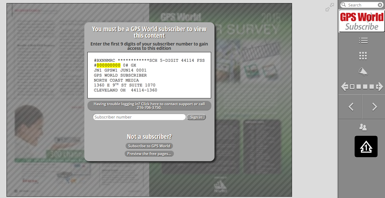 The first few pages of each monthly digital edition is available as a preview. When the maximum number of views is reached, the reader will receive a prompt to enter the subscriber number.