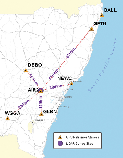 A precise wide-area positioning technique for airborne trajectory solutions provides both relative and absolute accuracies similar to those derived from usinga local GNSS reference station. Irrespective of which reference sites are used and once calibration and antenna modeling issues are addressed, the absolute comparison with ground control is well within the required accuracies. With the configuration of a GNSS network such as CORSnet-NSW (when complete, at least one site will always be within 150 kilometers of any point within New South Wales), an airborne LiDAR survey in the network’s service area can provide data for computation of an accurate sensor trajectory. This potentially negates the need to place and maintain ground reference stations close to the survey area — an exercise which not only requires significant resources but also reduces the operational flexibility of the aircraft.