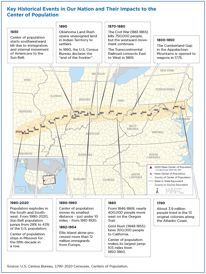 Here is a graphic from the U.S. Census identifying significant historical events along with the westward movement of the center of population: