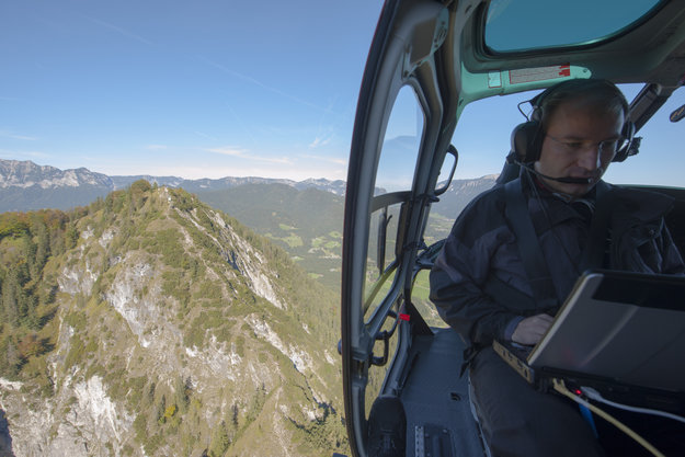 A helicopter flies over the Galileo Test and Development Environment – GATE – in Berchtesgaden, Germany, gathering data on how EGNOS and Galileo will work together. The promising results from the testing are now being analyzed.