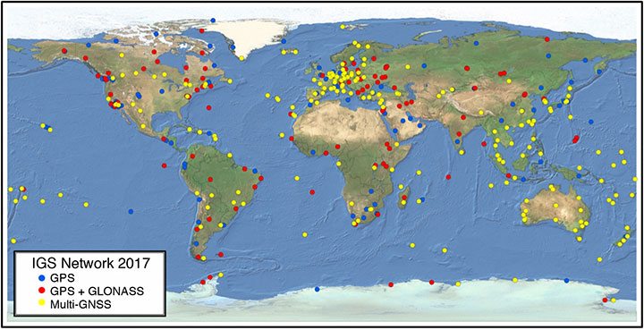 FIGURE 1 . The extent of the IGS network in 2017, showing the locations of stations monitoring just GPS, GPS and GLONASS, and GPS and GLONASS plus at least one other constellation. (Map: IGS)