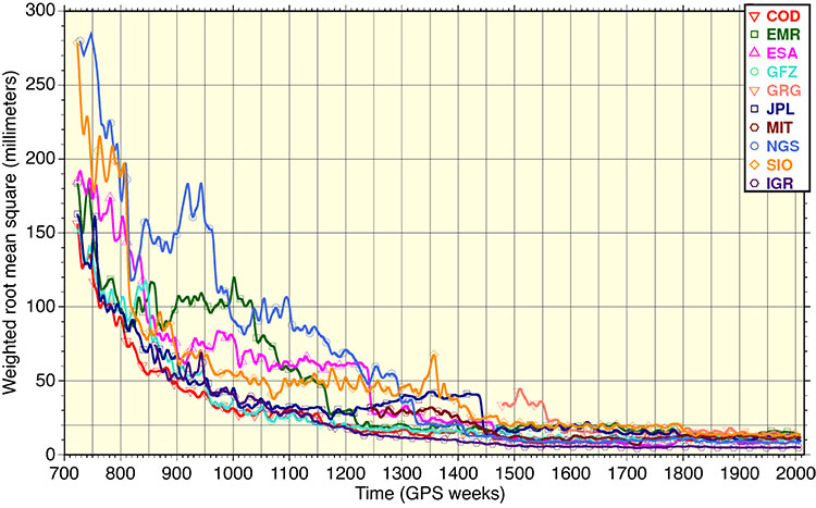 FIGURE 3 shows the huge improvement in the precision and accuracy of the final orbit submissions from the analysis centers over the past 25 years.