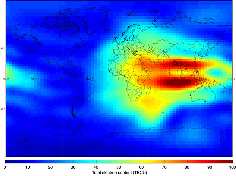 FIGURE 4 shows an example TEC map recomputed from data collected on March 17, 2015. The large values of TEC in the ionosphere’s equatorial anomaly are plainly visible.