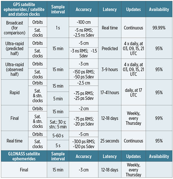 TABLE 1 shows the quality of service characteristics of the various IGS GPS and GLONASS orbit and clock products. Similarly, TABLES 2, 3 and 4 show the characteristics of the tracking station coordinates, Earth rotation parameters and atmospheric parameters. See www.igs.org/products for further details.