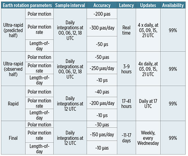 TABLE 3. Quality of service characteristics for Earth rotation parameters: polar motion coordinates and rates of change and length-of-day (µas = microarcsecond). (Data: IGS)