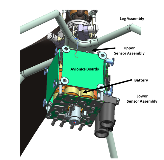 The electronics are carried in the electronics core module (ECM), which is mounted inside the insulated box and mechanically attached to a central, hollow, structural tube, on which the flight motors, rotors and landing legs are all attached. The electronics box has a 3-cm gap between the skin and the ECM, which is filled with inert, insulating carbon dioxide gas — heat retention and power management are the basics for survival on the Mars surface. Keeping the batteries above –15 °C is the design goal for the temperature control system, which also enables the electronics and sensors to survive and operate.