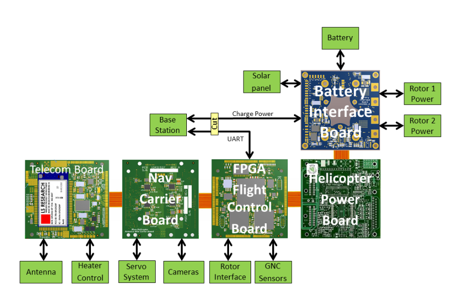 The avionics boards are wrapped around the heated battery-pack with the battery interface board at the bottom, along with the FPGA/flight controller board (FFB), the NAV/servo controller board (NSB), the telecom board (TCB) and the helicopter power board (HPB) mounted vertically. The navigation camera (NC) and the return-to-Earth (RTE) camera are both slung from the front, lower (direction of flight) side of the ECM, peering through a clear window in the insulated box.