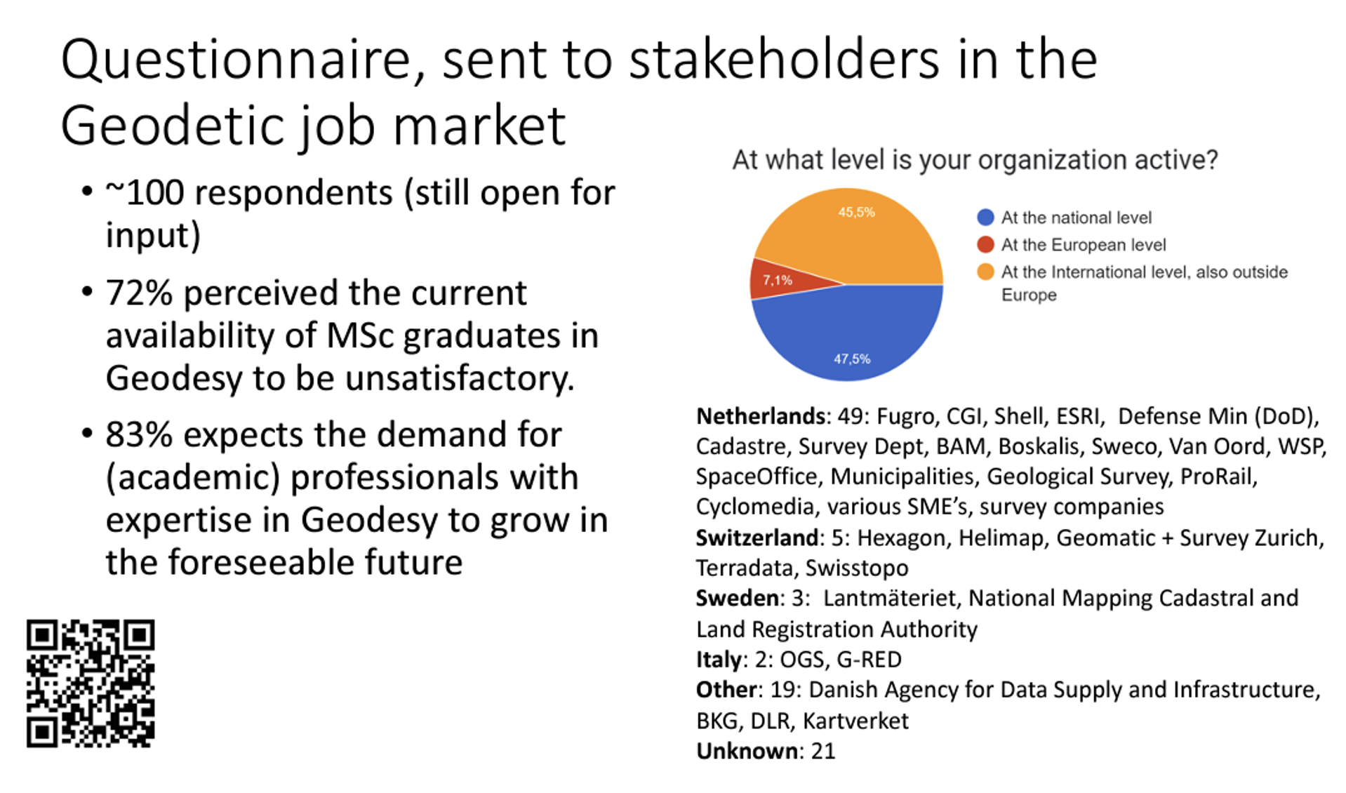 The group sent a questionnaire to stakeholders in the geodetic job market to obtain an understanding of the need for trained geodesists. The responses to the questionnaire highlighted the urgent need for more trained geodesists. Two important responses by stakeholders were (1) 72% perceived the current availability of MSc graduates in geodesy to be unsatisfactory and (2) 83% expects the demand for (academic) professionals with expertise in geodesy to grow in the foreseeable future.