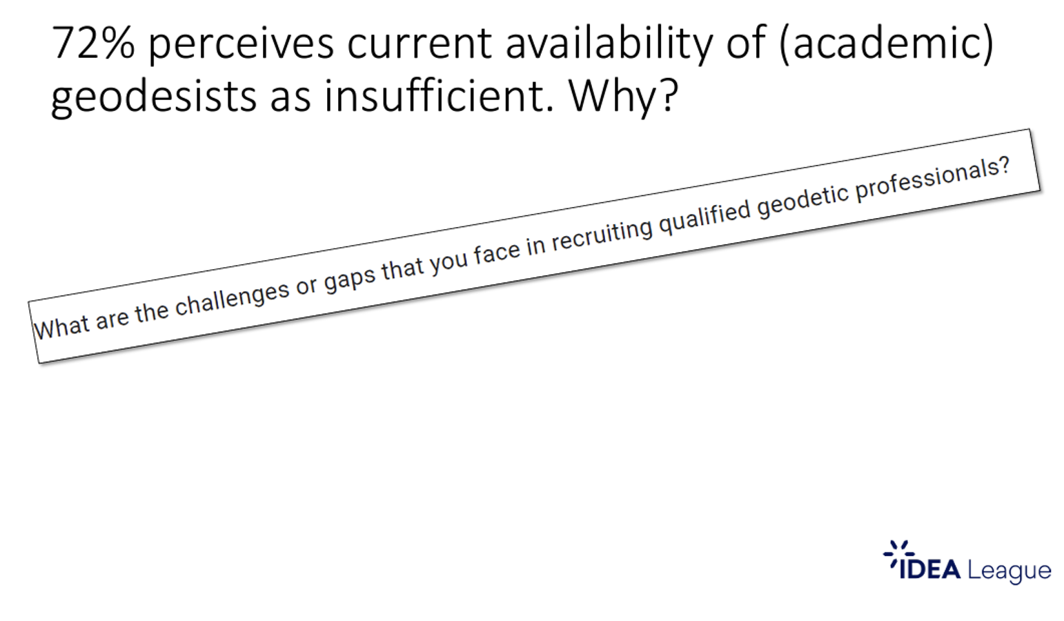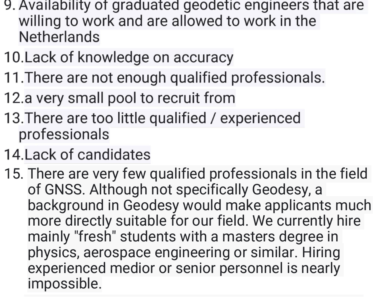 As mentioned above, 72% perceived the current availability of MSc graduates in geodesy to be unsatisfactory. The questionnaire asked, “What challenges or gaps do you face in recruiting qualified geodetic professionals?”