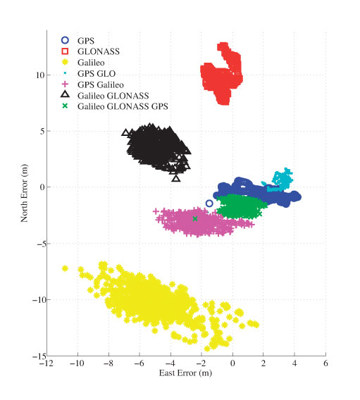 Pseudorange and Doppler observations were extracted from the tracking strategies at a rate of 2 Hz. Single-frequency single-point position solutions were then computed for each of the three systems, each of the three pairs of systems and for the full combined Galileo-GLONASS-GPS. In the case of the three-satellite Galileo solution, the height was held fixed. Figure 1 shows 2D position errors with respect to antenna ITRF coordinates. Departures of the solutions involving GLONASS are likely due to orbital biases, given location of Calgary with respect to GLONASS ground stations.