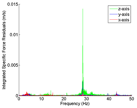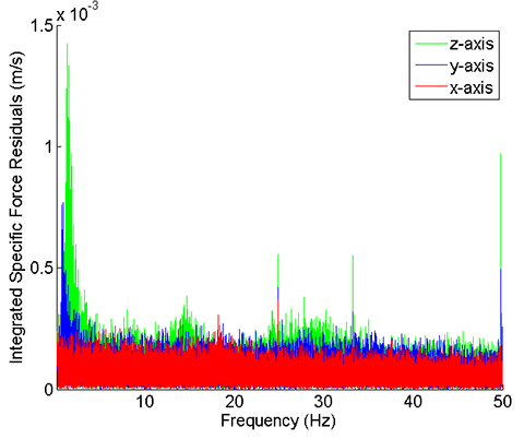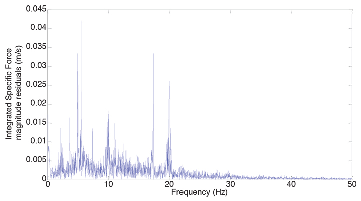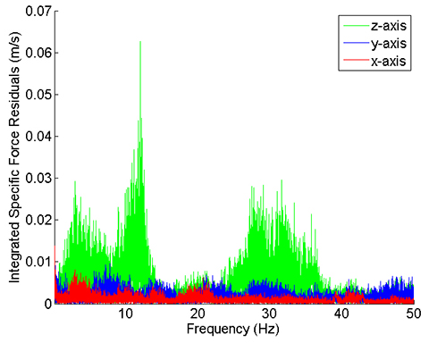 Behavioral Detection, Accelerometers. The use of accelerometers to detect behavioral context is well established. However, by looking at the vibration spectra, more information can be extracted. For these experiments, specific force data was collected using an Xsens MTi-G IMU/GNSS device, the mean subtracted to remove most of the gravity, and a discrete Fourier transform obtained using the MATLAB function fft. Figures 9 and 10 respectively show the vibration spectra of the specific force magnitude for an IMU on a table and held by a stationary pedestrian. The table spectrum is approximately white, whereas the pedestrian data shows peaks between 6 and 10 Hz.