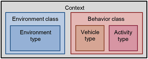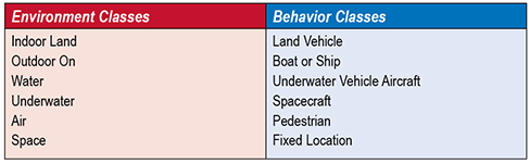 Figure 15 shows the relationships in a five-attribute framework, comprising environment class, environment type, behavior class, vehicle type, and activity type. The environmental and behavioral contexts are treated separately because they perform fundamentally different roles in navigation. Environmental context concerns the availability of signals and other features that may be used for determining position whereas behavioral context is concerned with motion.