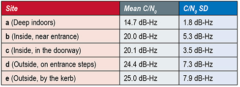 As expected, the average received C/N0 is lower indoors than outdoors and lower deep indoors than near the entrance. Furthermore, the standard deviation of the C/N0 measurements is larger outdoors than indoors and also larger near the entrance to the building than deep indoors. Thus, both the mean and the standard deviation of the measured C/N0 across all GNSS satellites tracked are useful both for detecting indoor and outdoor contexts and for distinguishing between different types of indoor environment.