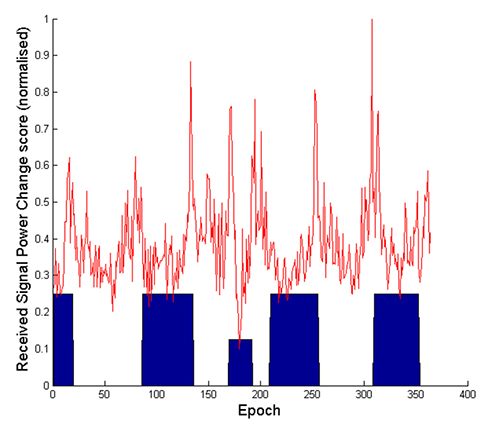 Context-change score results are presented in Figure 8. The large blue blocks indicate when the user was outside and the smaller blue block shows when the user was in the building’s basement, a very different Wi-Fi environment. As can be seen, there are clear peaks in the “context change” score whenever the user moves between indoor and outdoor contexts.