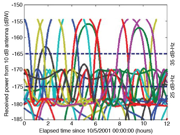 Acquisition Thresholds. The received power of the signals tracked with the hemispherical antenna is plotted in the top half of FIGURE 5. The lowest power level recorded was approximately –178 dBW, 3 dBW below the design goal. (Note the difference in scale from Figure 1, which assumed an additional 6 dB of antenna gain.) The bottom half of Figure 5 shows a histogram of the tracked signals. It is clear that most of the signals tracked by Navigator had received power levels around –175 dBW, or 10 dBW weaker than a traditional receiver’s acquisition threshold.