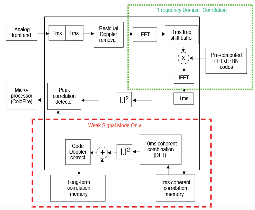 Exceptional Navigator. One exception is the Navigator receiver. It uses a highly specialized hardware acquisition engine designed around an FFT correlator. This engine can be thought of as more than 300,000 correlators working in parallel to search the entire Doppler-delay space for any given satellite. The module operates in two distinct modes: strong signal mode and weak signal mode. Strong signal mode processes a 1 millisecond data record and can acquire all signals above –160 dBW in just a few seconds. Weak signal mode has the ability to process arbitrarily long data records to acquire signals down to and below –175 dBW. At this level, 0.3 seconds of data are sufficient to reliably acquire a signal.