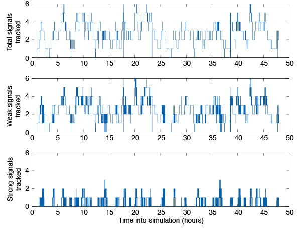 Tracked Satellites. The top plot of FIGURE 4 illustrates the total number of satellites tracked by the Navigator receiver during a two-day run with the hemispherical antenna. On average, Navigator tracked between three and four satellites over the simulation period, but at times as many as six and as few as zero were tracked. The middle pane depicts the number of weak signals tracked—signals with received carrier-to-noise-density ratio of 30 dB-Hz or less. The bottom panel shows how many satellites a typical space receiver would pick up. It is evident that Navigator can track two to three times as many satellites at GEO as a typical receiver, but that most of these signals are weak.