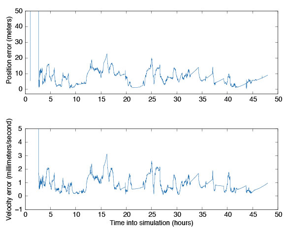Navigation Filter. To validate the integration of the GEONS software, we compared its estimated states to the true states over the two-day period. These results are plotted in FIGURE 6. For this simulation, we assumed that GPS satellite clock and ephemeris errors could be corrected by applying NASA’s Global Differential GPS System corrections, and errors caused by the ionosphere could be removed by masking signals that passed close to the Earth’s limb. The truth environment consisted of a 70X70 degree-and-order gravity model and sun-and-moon gravitational effects, as well as drag and solar-radiation pressure forces. GEONS internally modeled a 10X10 gravity field, solar and lunar gravitational forces, and estimated corrections to drag and solar-radiation pressure parameters. (Note that drag is not a significant error source at these altitudes.) Though the receiver produces pseudorange, carrier-phase, and Doppler measurements, only the pseudorange measurement is being processed in GEONS.
