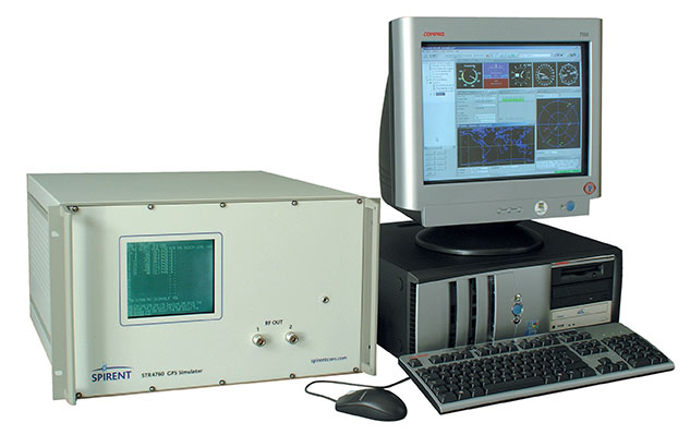 We used an external, high-fidelity orbit propagator to generate a two-day GEO trajectory, which we then used as input for the Spirent STR4760 GPS simulator. This equipment, shown in the accompanying photo, combines the receiver’s true state with its current knowledge of the simulated GPS constellation to generate the appropriate radio frequency (RF) signals as they would appear to the receiver’s antenna. Since there is no physical antenna, the Spirent SimGEN software package provides the capability to model one.
