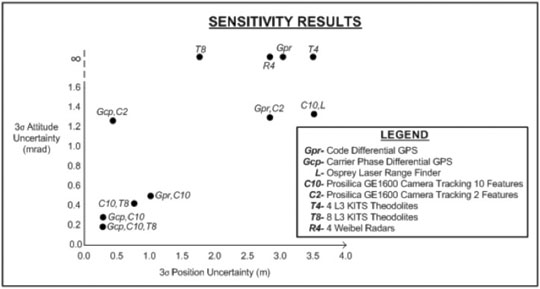 The goal of the sensitivity analysis is to determine the minimal set of sensors that will meet next generation TSPI performance requirements. Sensor models and world characteristics are used to calculate expected position, velocity, and attitude uncertainty given a particular trajectory, sensor package, and feature set. The aircraft’s state vector, x, as a function of the measurement, z, and uncertainty matrix, R, is represented as