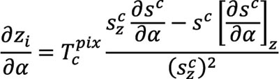 where Tcpix is the camera frame to pixel frame transformation matrix made up of calibration parameters, sc is the line of sight vector from the camera to the target expressed in the camera frame, Cnb and Cbc are direction cosine matrices, and the subscript z denotes the z dimension of the indicated navigation frame. The partial derivative of the pixel coordinate of an image feature with respect to attitude, α, is calculated as