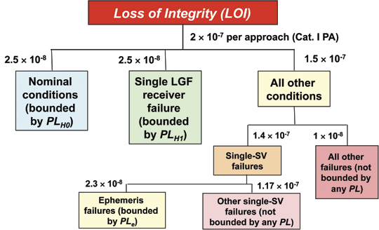 To understand how specific risk differs from average risk, it helps to start with a fault-tree representation of risk in which loss of integrity (LOI) can result from any of the nodes of the tree. Figure 2 shows a simplified example of a fault tree for CAT I GBAS. It shows the allocation of the CAT I total integrity risk requirement of 2 × 10-7 per approach to the various possible causes of integrity loss. In specific-risk analysis, each type of failure shown in the tree, if deemed to be a credible failure (meaning, in practice, that its assumed prior probability is larger than compared to its allocation in the fault tree), is assessed that the failure is guaranteed to occur in a worst-case fashion. This means that the variables that describe this particular failure scenario take the values that maximize the hazard to users. In an average-risk analysis, these variables would take many values according to their own probability distributions, and these distributions would be convolved together to provide an overall representation of risk under that scenario. Instead, one scenario drives the specific risk assessment for a particular user class, and it is the worst one possible from that user’s standpoint. (Another user class would be evaluated under a different set of parameters corresponding to the separate worst case for that user.) The improbability of the worst-case combination of parameters is not considered as long as the probability of the failure scenario as a whole is deemed high enough to be of concern.