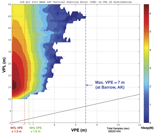 Figure 4 is a 2-D plot of position error versus protection level in the vertical axis (that is, VPE versus VPL) for all epochs and stations during the three months covered by the recent WAAS PAN Report #34 (July 1–September 30, 2010). These results are typical of the entire period since WAAS commissioning in 2003, particularly the last several years. The vertical lines on the plot indicate the 95th-percentile, 99th percentile, and maximum VPEs in this period (1.2, 1.8, and 7 meters, respectively). The maximum VPE occurred at Barrow, AK, which is one of the most remote stations in the WAAS network (see Figure 3). In comparison, the lowest VPLs (intended to be 1–10-7 bounds on VPE) are in the range of 10–15 meters, and values as high as 40 meters are not uncommon. The most demanding approach operation that WAAS supports, LPV-200, allows approaches to a 200-foot minimum decision height and requires that VPL be below a vertical alert limit (VAL) of 35 meters. HPL must also be below a horizontal alert limit (HAL) of 45 meters. When this is not the case, the approach operation is not available; thus these higher VPLs extract a significant cost.
