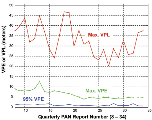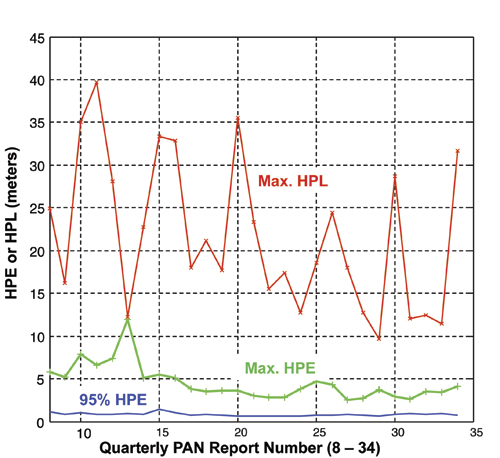 Figures 5 and 6 demonstrate that, while both 95 percent and maximum errors are quite low and are within the expected range of each other, the protection levels associated with the maximum errors greatly exceed them. This pattern is clearer in Figure 5 for vertical errors because maximum VPL tends to be more consistent across PAN reports, but it is true for horizontal errors as well.