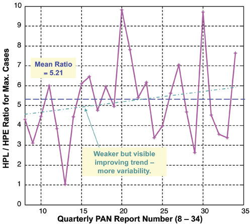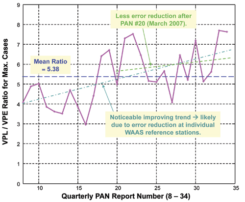 Figures 7 and 8 clarify this relationship by plotting the ratio of VPL to VPE and HPL to HPE for the station and time of the maximum error. The mean of this ratio is very high and is about the same in both cases: 5.38 for vertical and 5.21 for horizontal. Figure 7 shows a steady upward trend in the ratio that is mostly due to WRS improvements that resulted in maximum VPE being reduced over time. This trend is clearly visible in Figure 5 and appears to exceed the weaker trend of lowering VPL due to WAAS algorithm enhancements. The same trend is visible in the horizontal Figures 6 and 8 but is weaker due to the greater variability of maximum HPL over time.