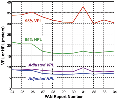 Using the above results, a preliminary estimate of the reduced WAAS protection levels that would apply to average-risk users can be made. Figure 9 shows a comparison between the actual 95 percent WAAS VPL and HPL and the adjusted VPL and HPL potentially achievable with WAAS (for the same 1–10-7 bounding probability) for average-risk users. The actual WAAS VPLs are taken from the more recent WAAS PAN Reports starting from #24 (covering January to March 2008) as the period from 2008 to 2010 includes most of the WAAS algorithm improvements introduced since commissioning in 2003. The actual 95 percent VPLs and HPLs represent the largest reported 95th-percentile values among the stations within CONUS for each quarterly period. The lower adjusted VPLs and HPLs are derived by dividing each VPL by a factor of 4.0 and each HPL by a factor of 2.5. These two reduction factors are derived from Figures 7 and 8, respectively, as conservative estimates of the ratio between protection levels and maximum position errors. Note that the factor of 2.5 for horizontal errors does not include the 12-meter error in Cleveland from PAN Report #13, as this is thought to be spurious (that is, not representative of actual WAAS behavior).