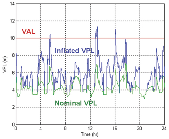 Because of the extreme rarity of the worst-case event that dictates this inflation, it would likely not be needed for average-risk users. Figure 11 shows how much the σvig inflation in Figure 10 increases the LAAS VPL at Newark for the standard 24-satellite constellation. The VPL reduction from removing the inflation is not as dramatic as the potential reductions shown for WAAS in Figure 9, but they are significant relative to the 10-meter VAL for LAAS CAT I approaches. Furthermore, the pre-inflated nominal value of σvig for LAAS is 6.4 millimeters/kilometer, which is much higher than the actual one-sigma nominal gradient value of 1–2 mm/km because, under specific risk, the very worst nominal data must be bounded (also, worst-case tropospheric gradients must also be bounded by σvig). Other broadcast parameters that affect VPL, such as σpr_gnd and the ephemeris P-value that bounds worst-case ephemeris failures, would also be reduced significantly by switching to average risk. Overall, it is likely that LAAS protection levels based on average risk would be reduced from the current specific-risk PLs by about the same range of factors (2–5) observed from WAAS data.