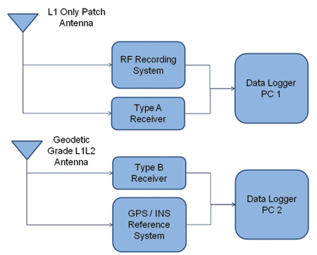 gh-sensitivity enabled, automotive-grade GPS L1 receiver using a patch antenna, WAAS-capable although WAAS usage was disabled in the real-time data collection. Type B receiver is a high-quality L1/L2 receiver using a geodetic-grade antenna, used with WAAS enabled. The GPS/INS system was connected to the geodetic-grade antenna. The RF recording system was also connected to the automotive-grade GPS L1 antenna.